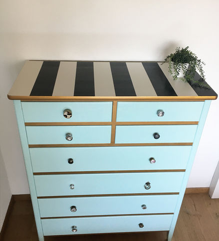 Die Kommode wurde von mir komplett erneuert. Die Seiten sind mit Vlies im Blumenmuster verarbeitet und mit keckem Streifenlook auf der Ablagefläche verziert. Die Kommode wirkt sehr verspielt und doch elegant.