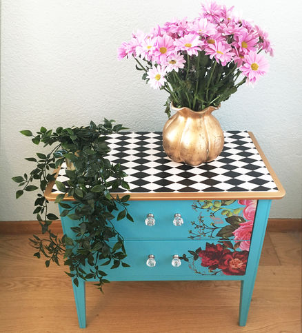 Frecher, frischer Nachtisch mit 2 Schubladen. Das Harlekin-Muster mit dem Goldrahmen wirkt sehr verspielt. - Das Blumendesign erfrischend und elegant zugleich. Sie ist die kleine Schwester von der Kommode "Leilani".